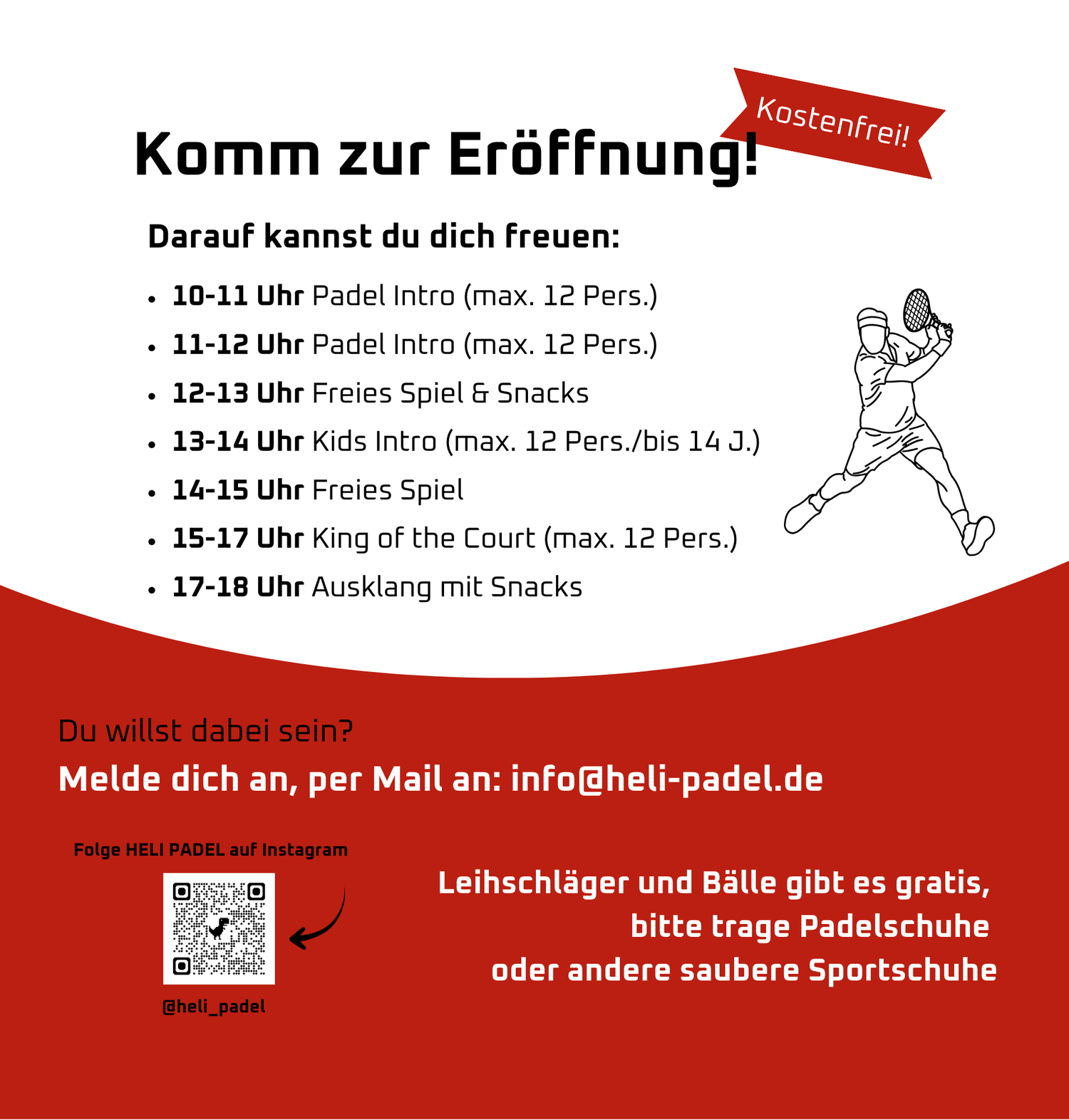 Sichere dir einen Platz durch Anmeldung zu den Programmpunkten per E-Mail an info@heli-padel.de.